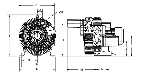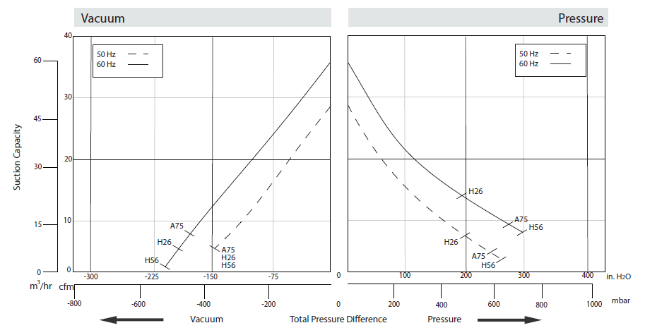 N/A The performance curves are based on air at a temperature of 59 ºF and an atmospheric pressure of 29.91 inch Hg with a tolerance of ±10%. The total pressure differences are valid for inlet and ambient temperatures up to 77 ºF. Suction capacity relates to inlet conditions. Pressure capacity relates to atmospheric conditions. For other conditions please contact Republic. Three phase motor tolerances are ±10% for fixed voltage motors and ±5% for voltage range motors. Single phase machines are designed with a ±5% tolerance. The frequency tolerance is ±2% maximum. |