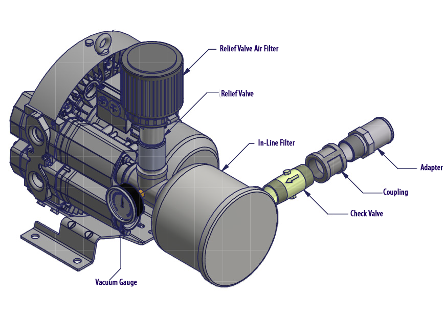 N/A All Republic Regenerative Blowers are available in pre-assembled kits for either pressure or vacuum applications. These kits include an inlet filter, gauge and relief valve, and are factory tested prior to shipment. Optional items for these kits include check valve, and tube adaptor; washdown motors, explosion proof motors, or other specialty motors; noise enclosures; and control panels such as VFD's, PLC's, or starter panels. |