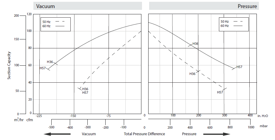 N/A The performance curves are based on air at a temperature of 59 ºF and an atmospheric pressure of 29.91 inch Hg with a tolerance of ±10%. The total pressure differences are valid for inlet and ambient temperatures up to 77 ºF. Suction capacity relates to inlet conditions. Pressure capacity relates to atmospheric conditions. For other conditions please contact Republic. Three phase motor tolerances are ±10% for fixed voltage motors and ±5% for voltage range motors. Single phase machines are designed with a ±5% tolerance. The frequency tolerance is ±2% maximum. |