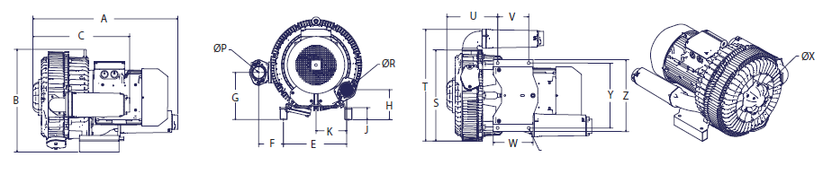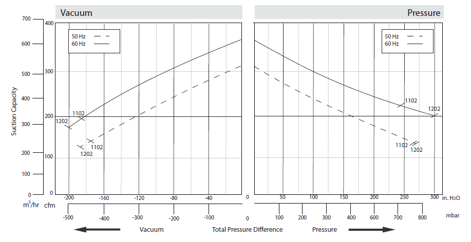 N/A The performance curves are based on air at a temperature of 59 ºF and an atmospheric pressure of 29.91 inch Hg with a tolerance of ±10%. The total pressure differences are valid for inlet and ambient temperatures up to 77 ºF. Suction capacity relates to inlet conditions. Pressure capacity relates to atmospheric conditions. For other conditions please contact Republic. Three phase motor tolerances are ±10% for fixed voltage motors and ±5% for voltage range motors. Single phase machines are designed with a ±5% tolerance. The frequency tolerance is ±2% maximum. |