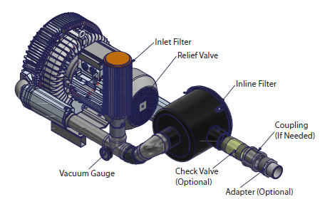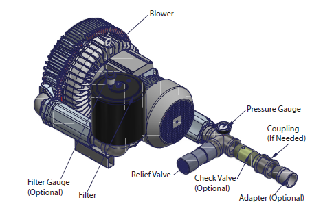 N/A All Republic Regenerative Blowers are available in pre-assembled kits for either pressure or vacuum applications. These kits include an inlet filter, gauge and relief valve, and are factory tested prior to shipment. Optional items for these kits include check valve, and tube adaptor; washdown motors, explosion proof motors, or other specialty motors; noise enclosures; and control panels such as VFD's, PLC's, or starter panels. |