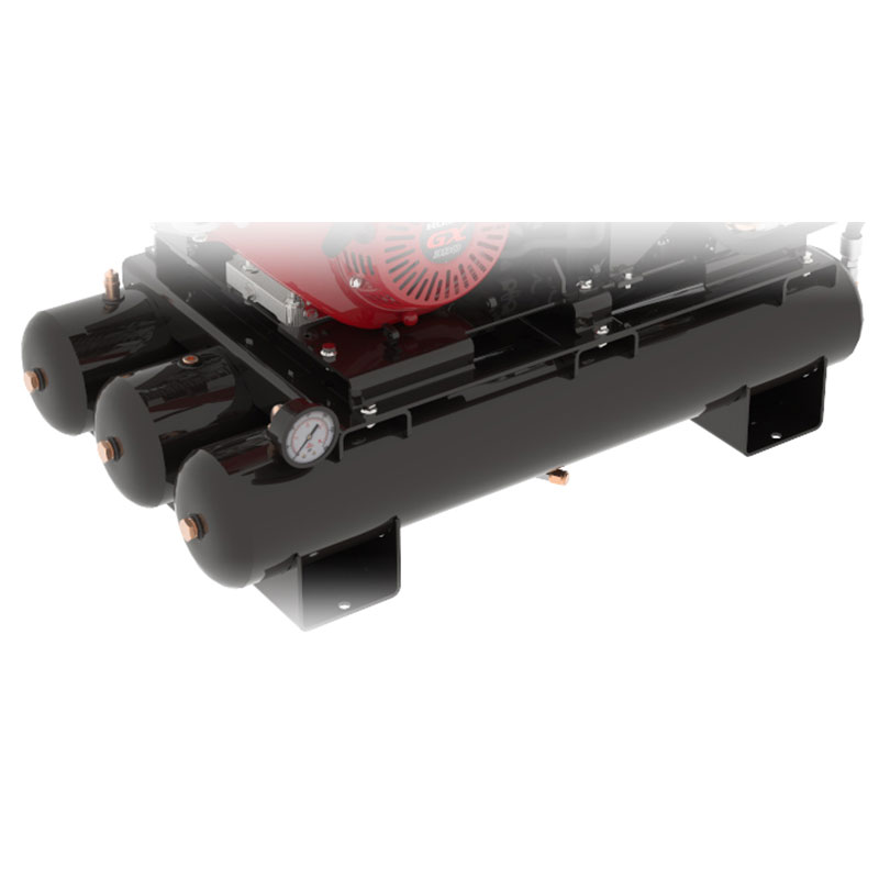 Triple 4-gallon air receiver tanks with mounting frame; including 200 psi pressure gauge, fittings, hose, ball valve and drain valves.